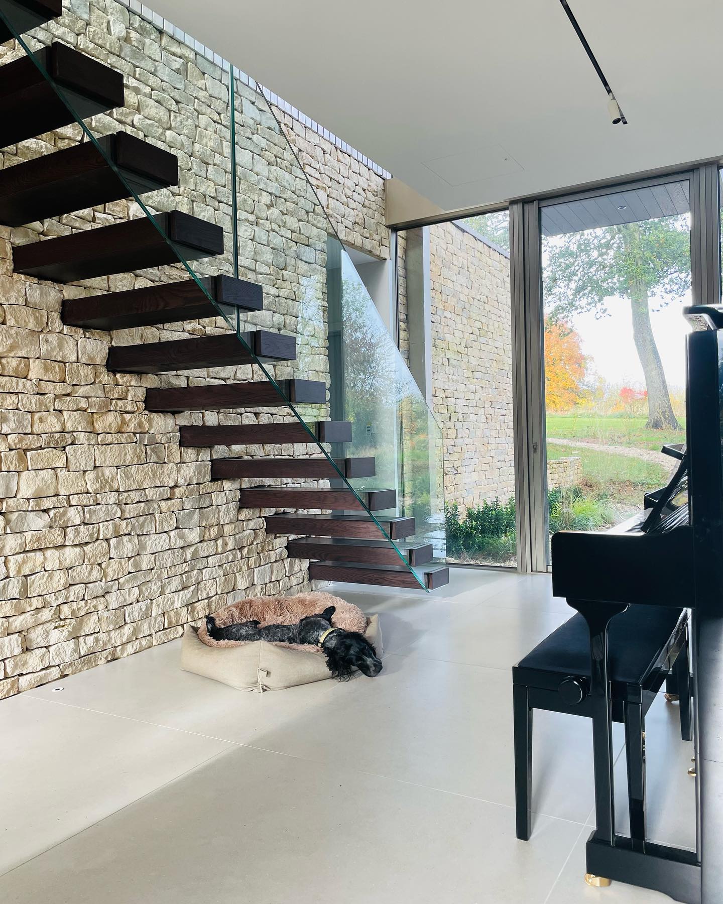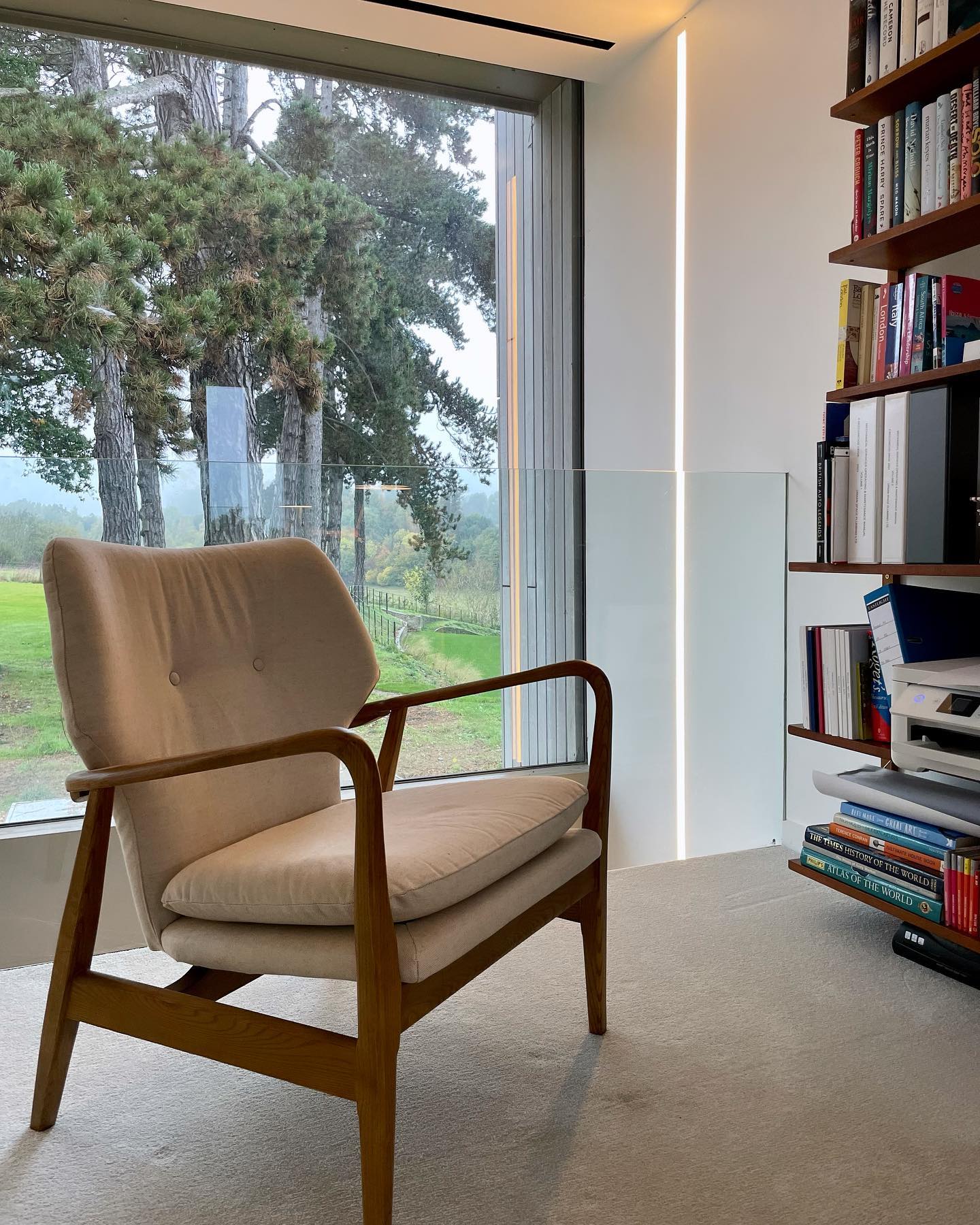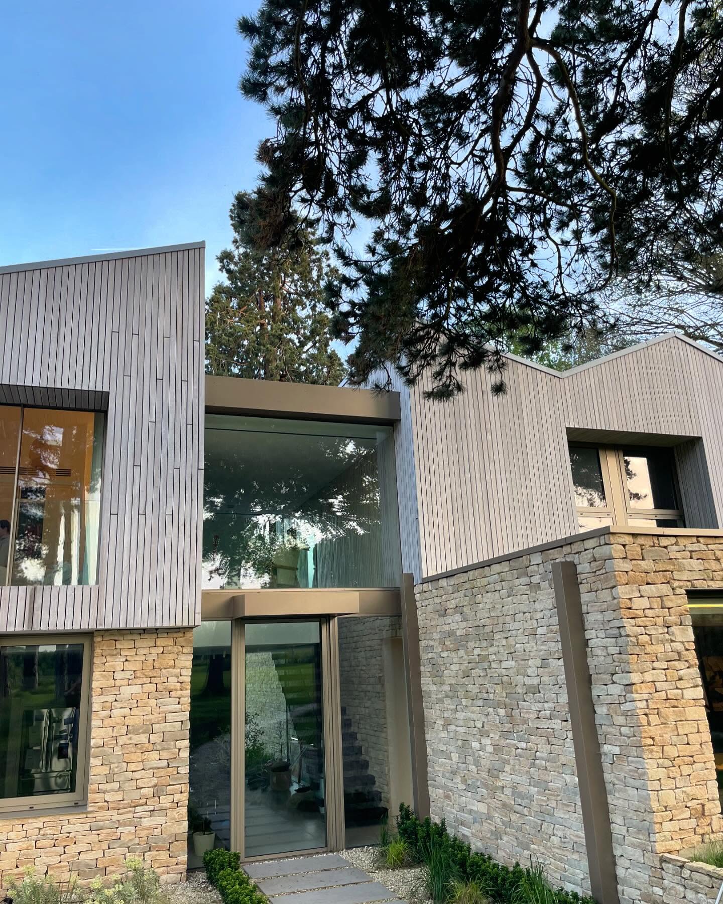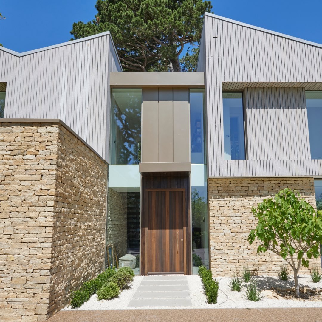 Located on a quiet cul-de-sac road to the west of Marlow, this replacement dwelling in a green belt location implied high levels of sensitivity to the design and planning process. The generous plot has mature pine and Wellingtonia trees to the north side, with views through to the open countryside beyond. The house is evocative of the hills behind mimicking the lines with its angled roofline. The floating cantilevered first floor sits majestically over the strong base and enclosure of the ground floor.