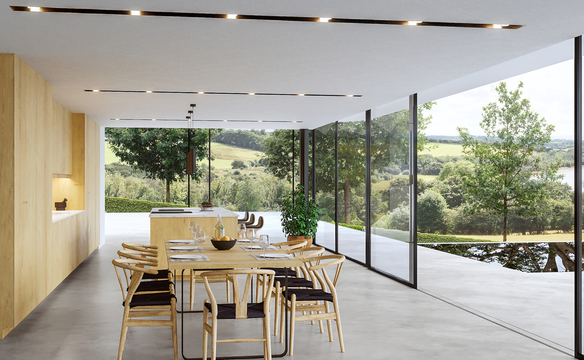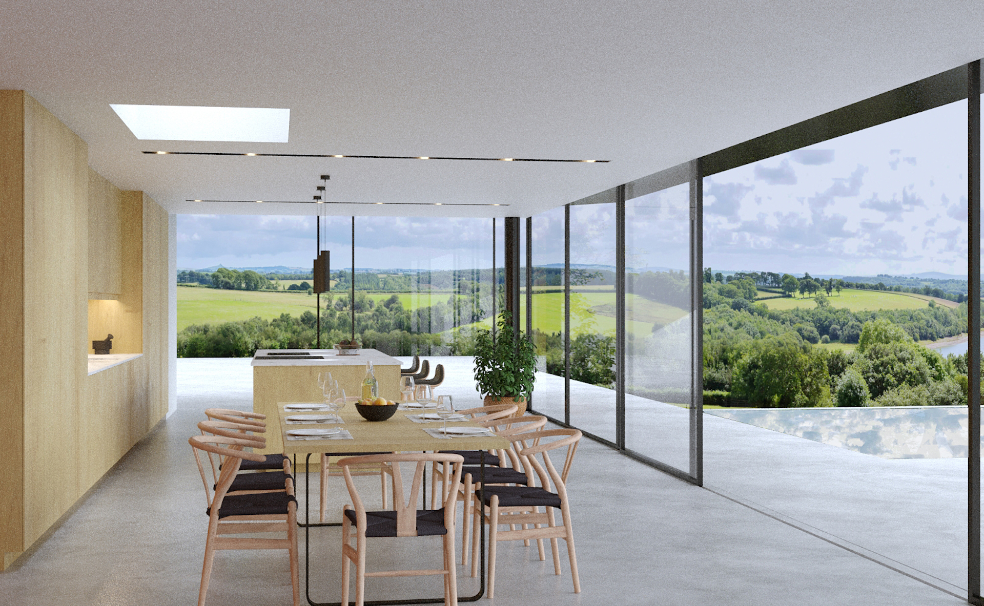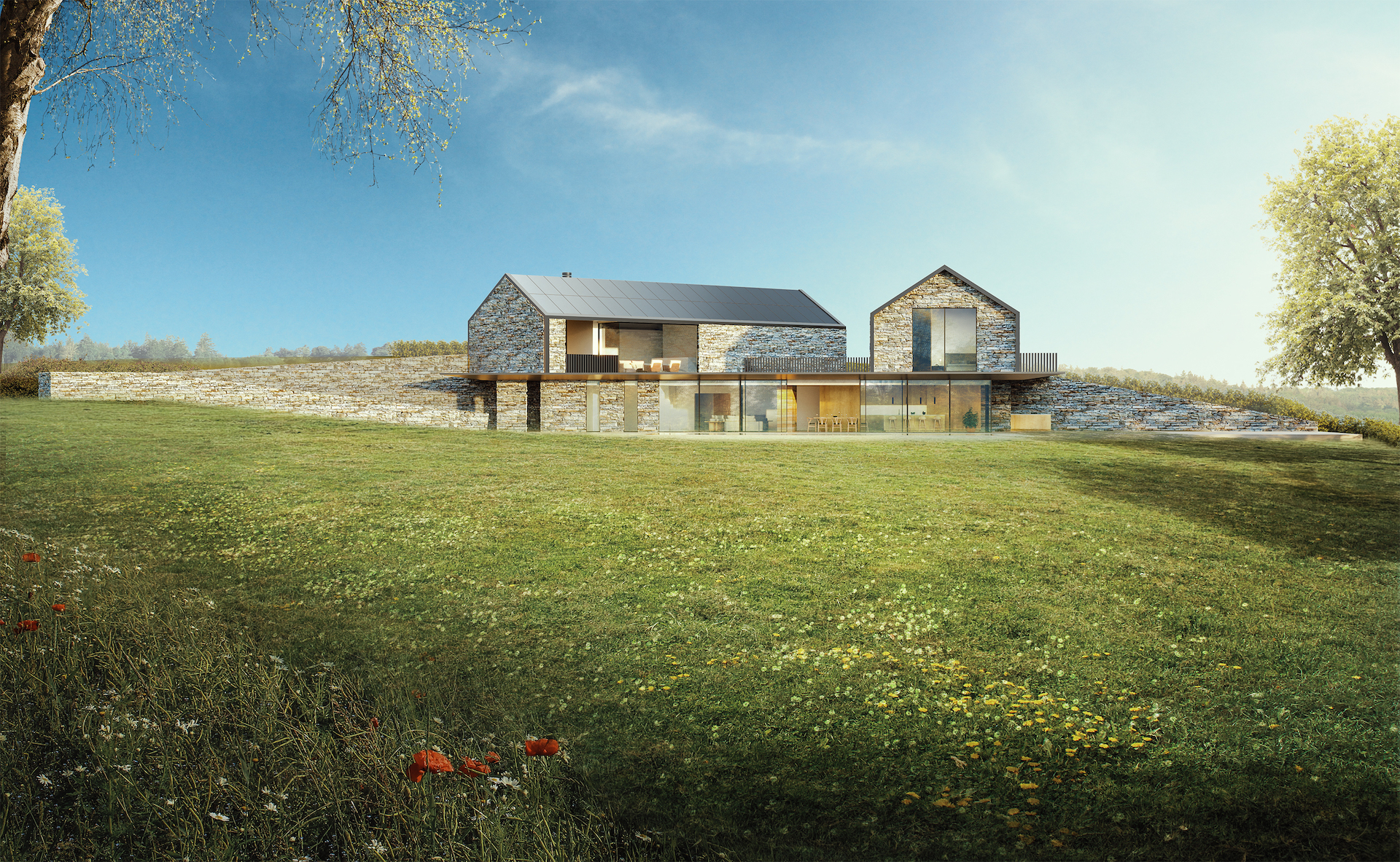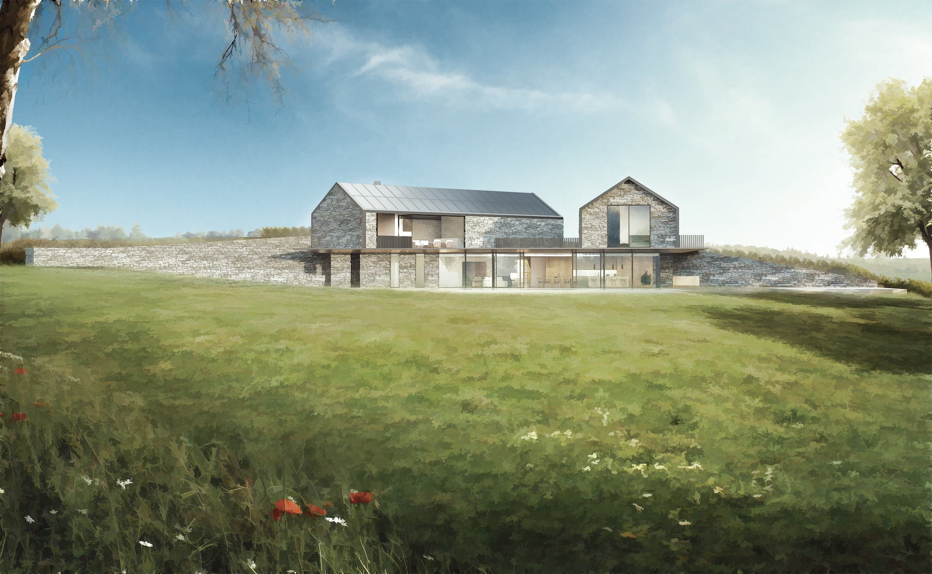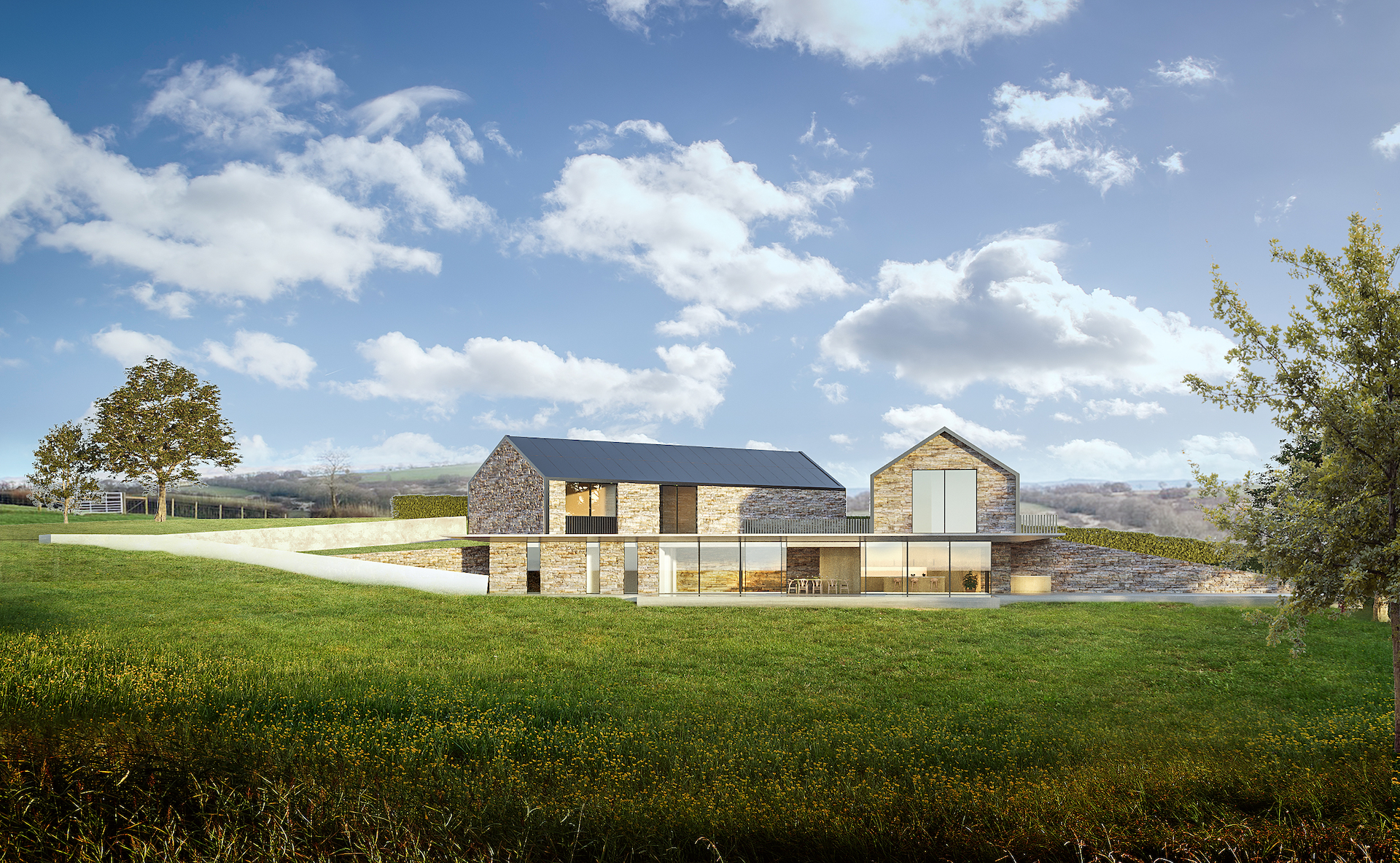 The proposals are a paragraph 84e scheme which relate to significant analysis of optioneering entrance points location and design typology. After extensive analysis of local farmsteads and barns, the final solution is a modern interpretation and series of forms relating to the views across the nearby lake. There are two balancing barns to the 1st floor which create a series of bedrooms linked through the main panoramic ground floor space.