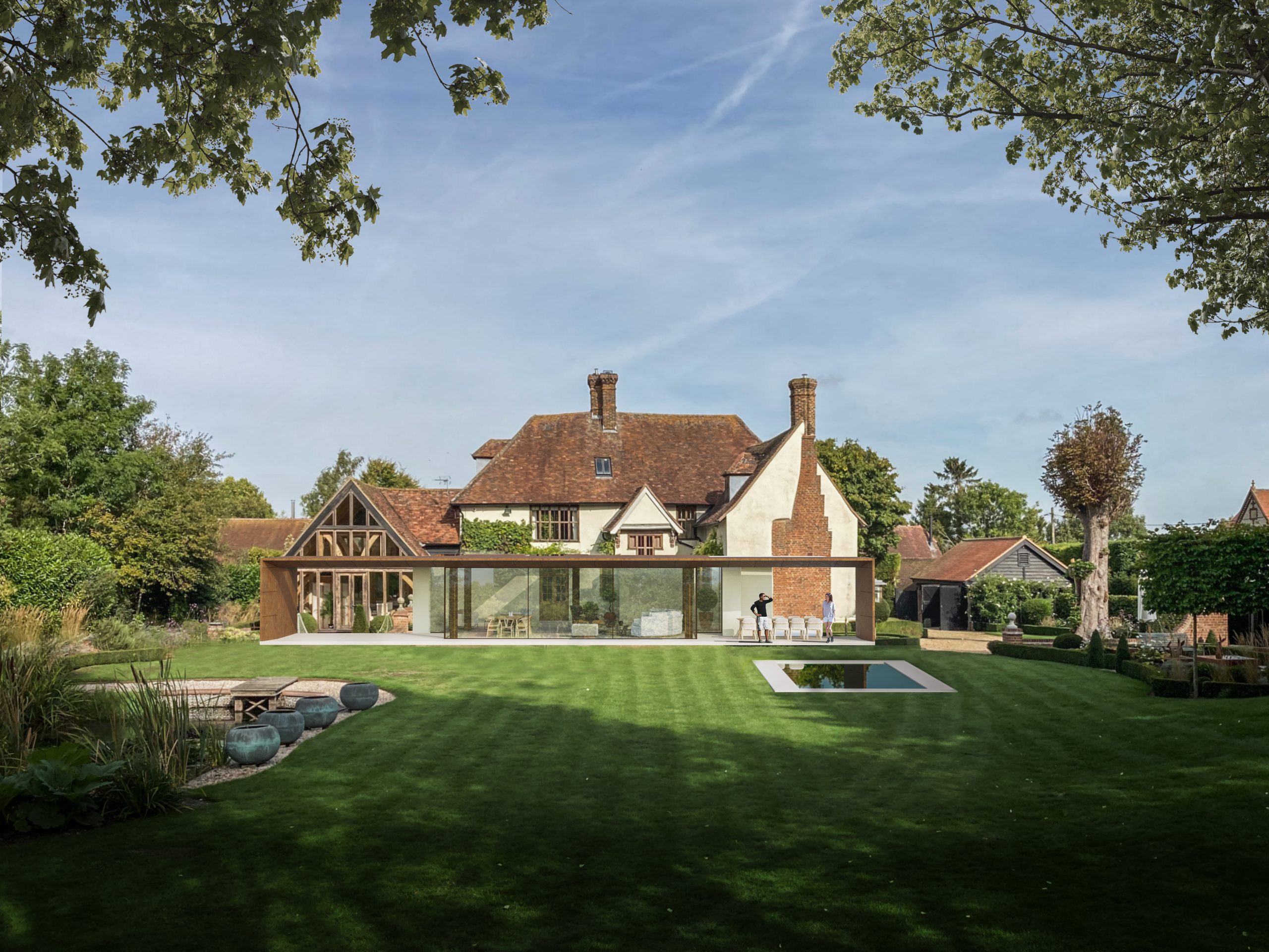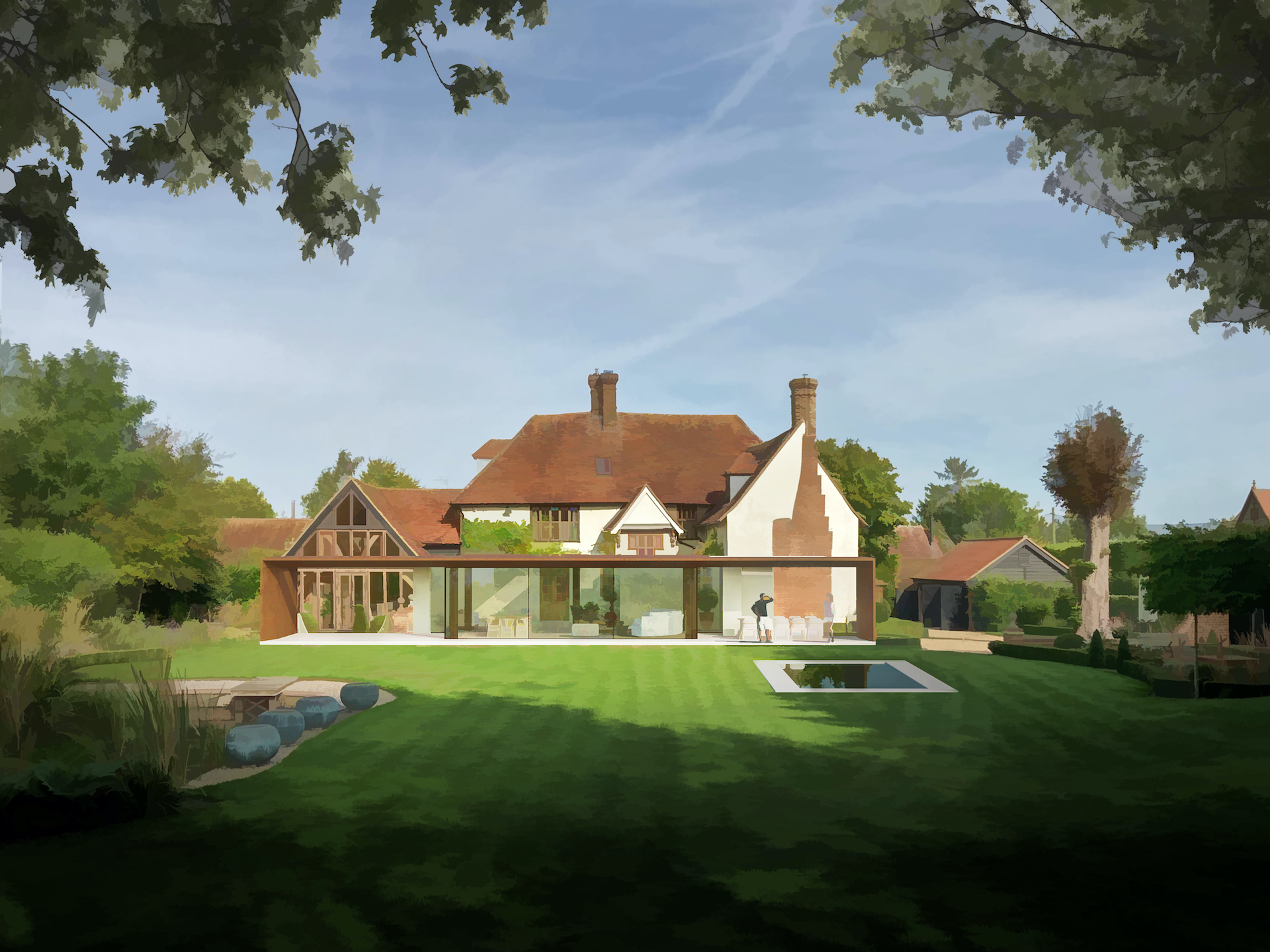 Set to the rear of this grade 2 listed building, the proposals were based on creating additional needed floor area for the family while being mindful of the significance of the building and how we could sensitively engage. The proposals were therefore to create a very transparent solution enabling the continuation of the reading of the 15th century staircase tower as well as the crows foot brickwork to the garden face.