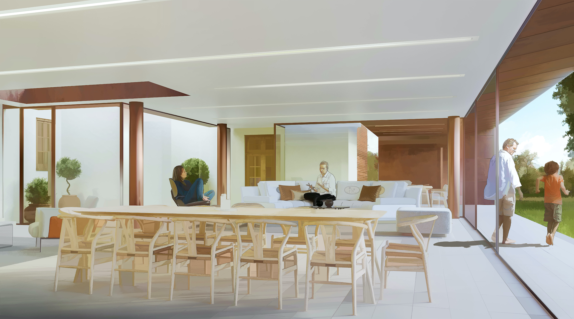 We proposed a slender corten flat roof with sedum finish, triple glazed sliding panels and two courtyards to the rear of the proposals to minimise the visible connections of the new to the old.